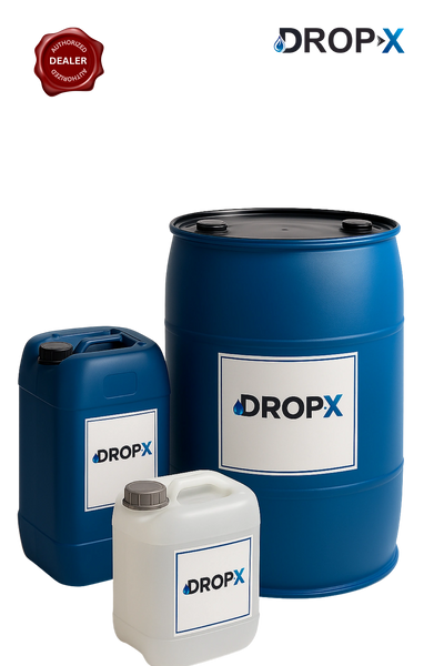 DropX Antiscalants are liquid formulations available in multiple grades optimized for different feedwater chemistries. Standard dosing ranges between 1 and 5 ppm depending on feed TDS, recovery, and LSI values. The products are effective within pH 5.0 to 9.0 and are compatible with polyamide and cellulose acetate membranes. They are supplied in 25 L, 50 L, and 200 L HDPE drums with a shelf life of 12 months under normal storage conditions. All DropX variants are non-corrosive, non-toxic, and safe for use in potable water applications when dosed as recommended.